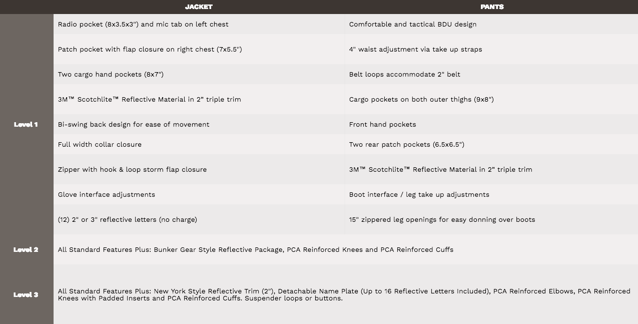 Our Jackets & Pants are available in either Tan or Black, and Level 3 garments are also available in Navy.