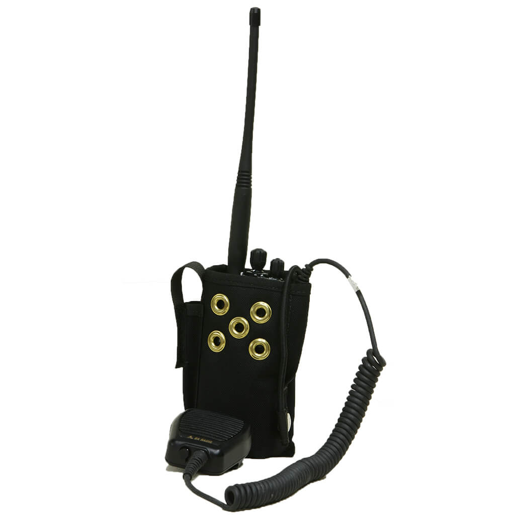 The Ruffian Bendix King Rincon style belt mounted radio pouch accommodates the BK KNG-P150 and KNG-P400. The P150 radio will fit in the holster with both the plastic belt clip and the larger battery pack. We added a 1/4″ foam inside to provide structure to keep it open. The radio holster is equipped with containment bungee and snap to secure the radio. The P150 radio pack attaches to equipment belts with ALICE clips.